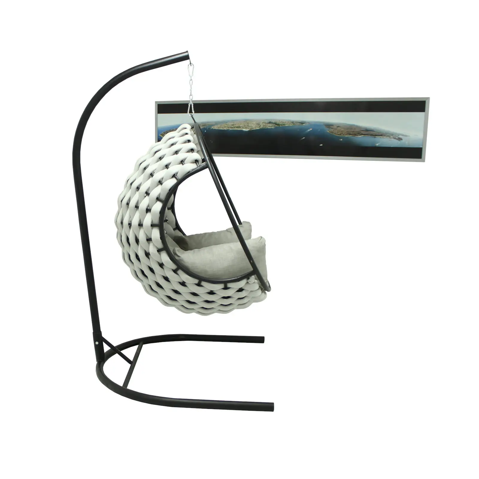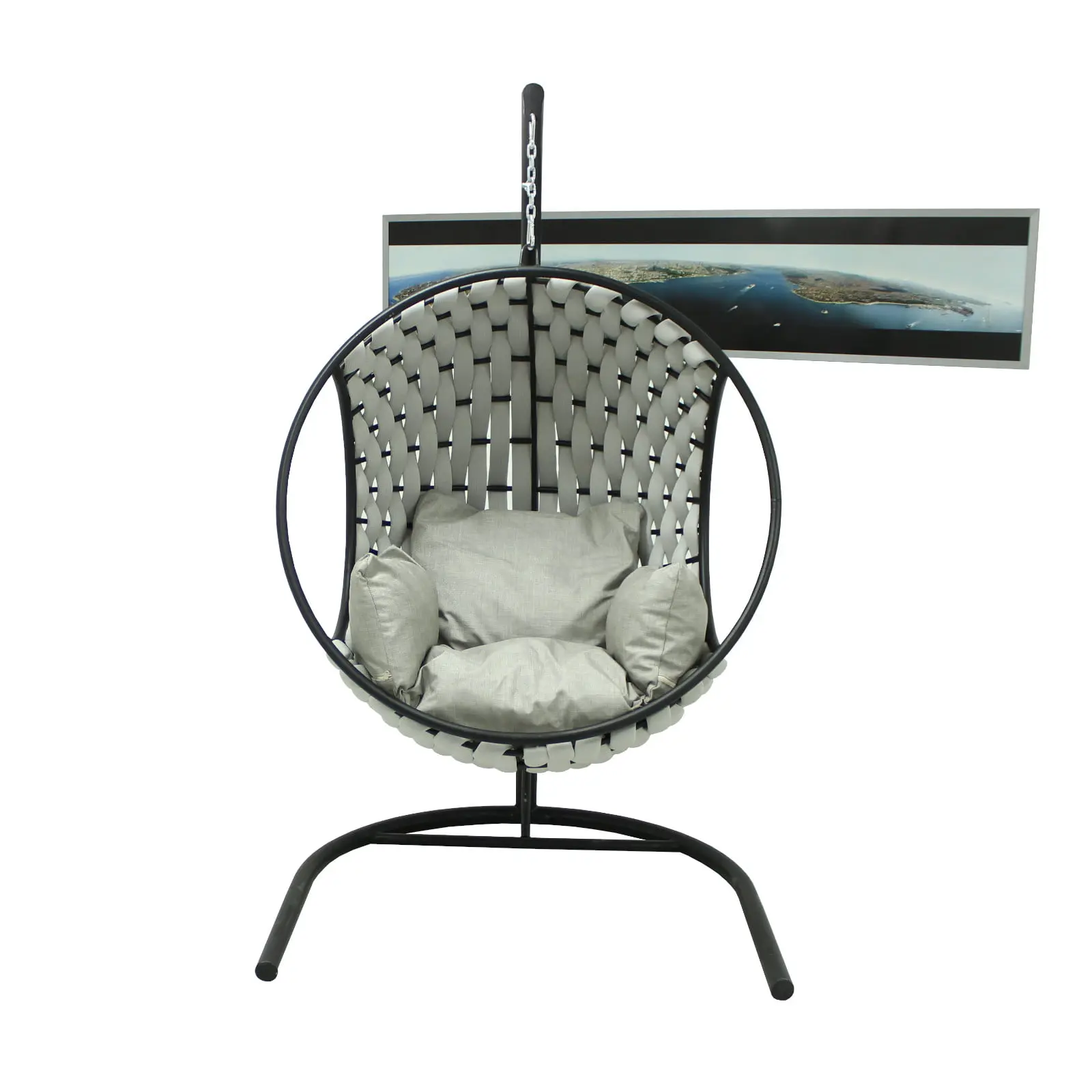 Leagănul rotund din poliester este ideal pentru grădină, terasă, balcon spațios sau spații comerciale, oferind un loc confortabil pentru relaxare și momente plăcute alături de familie și prieteni. Suportul metalic negru și perna capitonată asigură durabilitate și confort sporit.