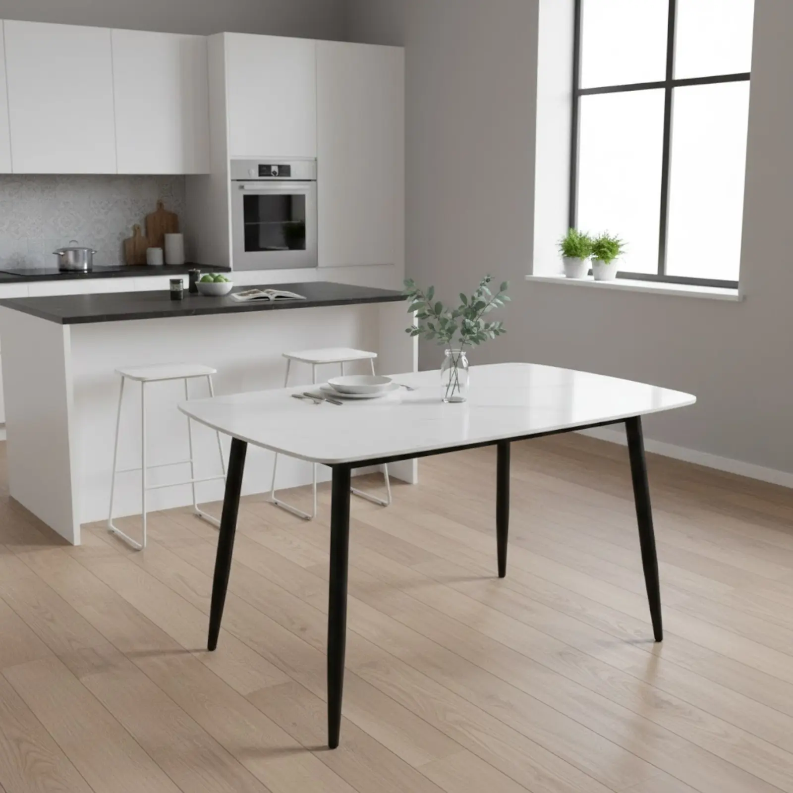 Fabricată din piatră sinterizată de înaltă calitate, suprafața sa lucioasă rezistă la zgârieturi și pete, astfel că poate fi utilizată zilnic fără griji. Blatul de 10 mm conferă un plus de robustețe, iar designul scandinav cu linii curate și colțuri rotunjite adaugă un aer contemporan și elegant.