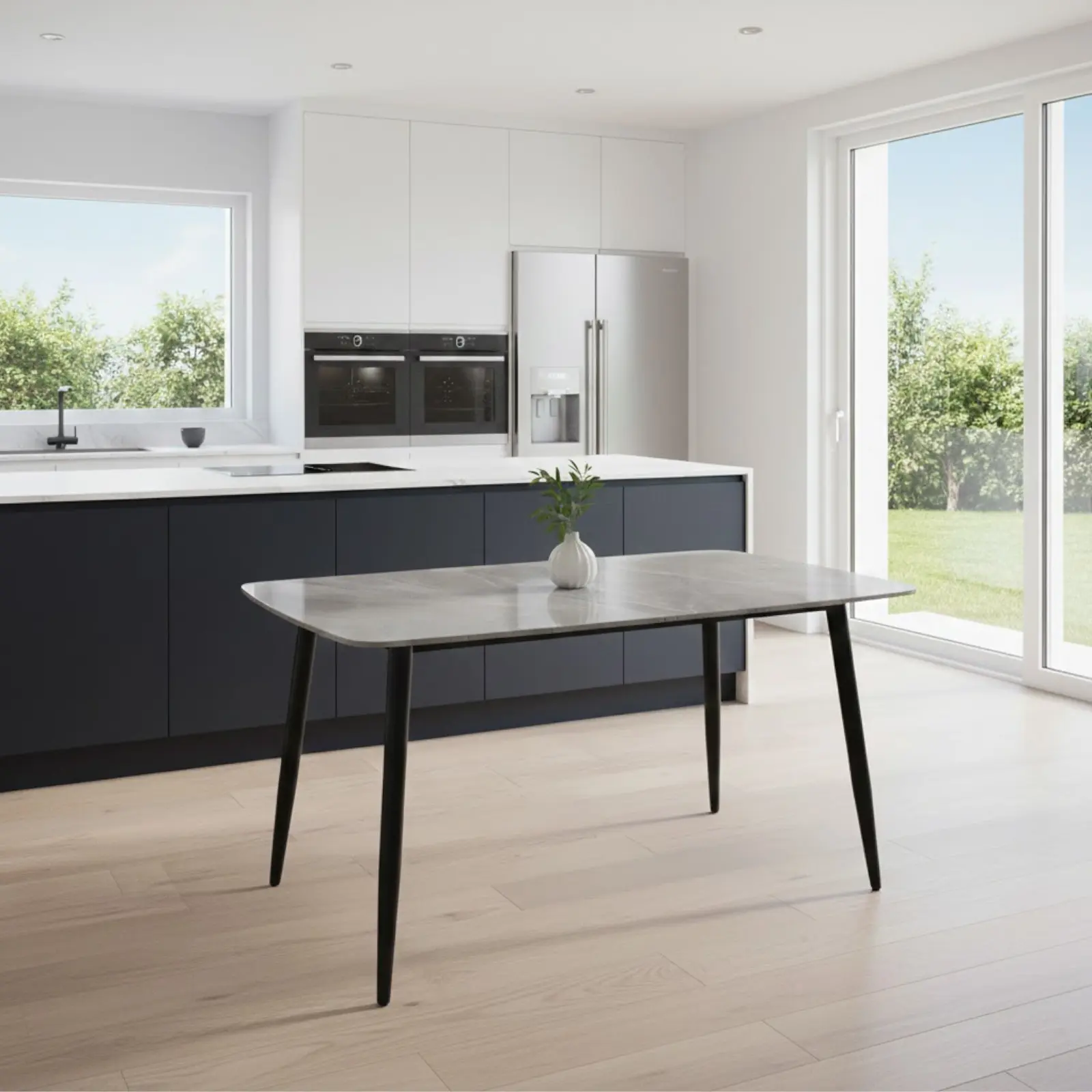 Fabricată din piatră sinterizată de înaltă calitate, suprafața sa lucioasă rezistă la zgârieturi și pete, astfel că poate fi utilizată zilnic fără griji. Blatul de 10 mm conferă un plus de robustețe, iar designul scandinav cu linii curate și colțuri rotunjite adaugă un aer contemporan și elegant.