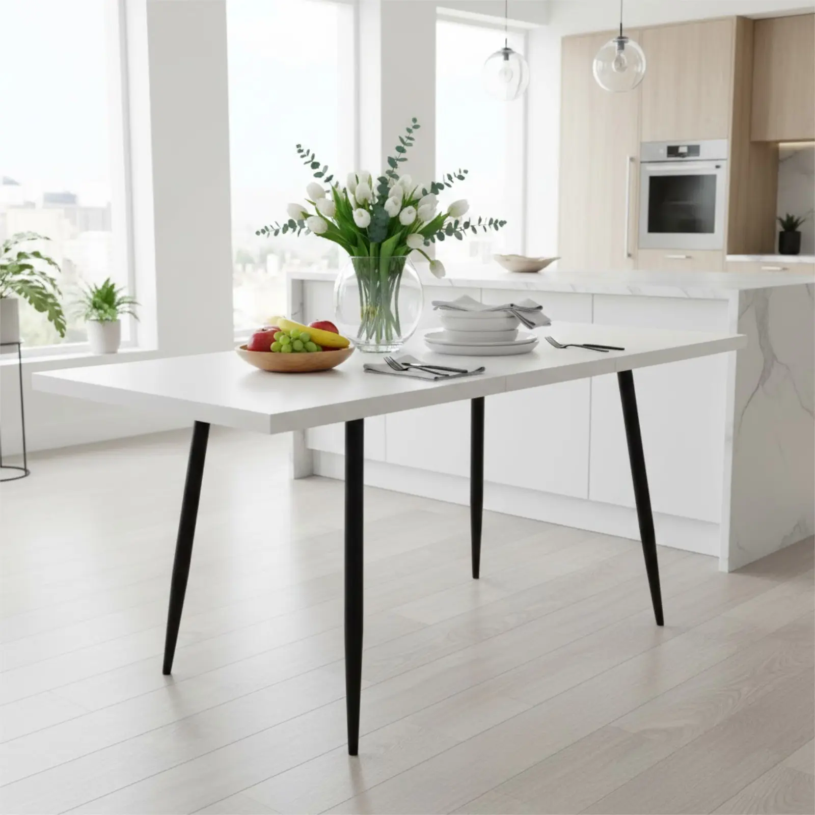 Masa extensibilă Lisabona Albă este alegerea perfectă pentru cei care își doresc un spațiu de dining elegant și adaptabil. Finisajul alb cu aspect de stejar natural oferă luminozitate încăperii și se integrează armonios atât în decoruri moderne, cât și în amenajări minimaliste sau contemporane.