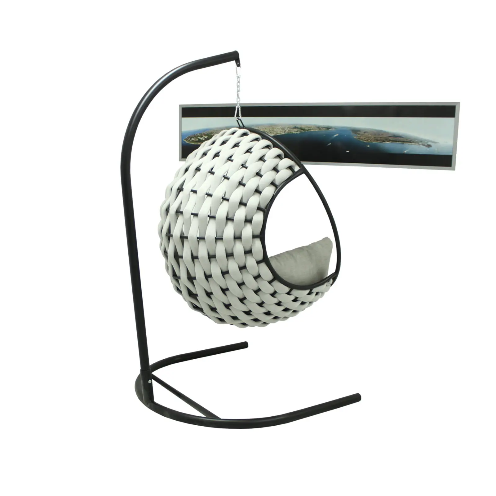 Leagănul rotund din poliester este ideal pentru grădină, terasă, balcon spațios sau spații comerciale, oferind un loc confortabil pentru relaxare și momente plăcute alături de familie și prieteni. Suportul metalic negru și perna capitonată asigură durabilitate și confort sporit.