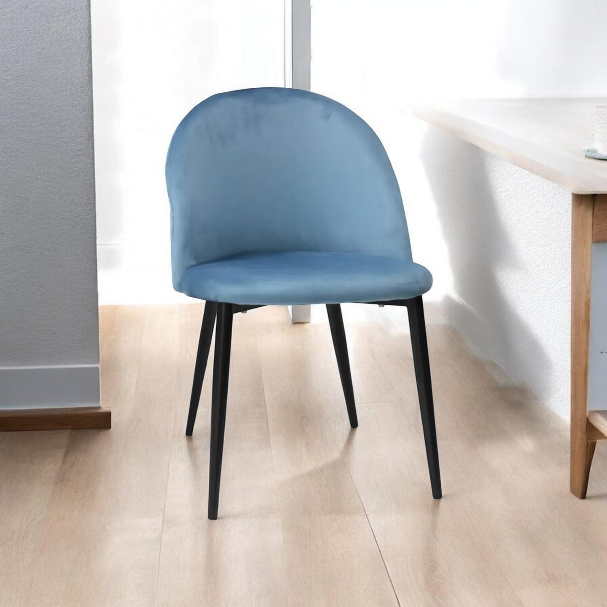 Scaun Bella Albastru cu Picior Negru din textil combină design modern și confort. Șezut și spătar capitonate, schelet metalic rezistent. Ideal pentru bucătărie, living, dormitor, hol sau spații HoReCa. Dimensiuni: H 78 cm x L 50 cm x l 52 cm.