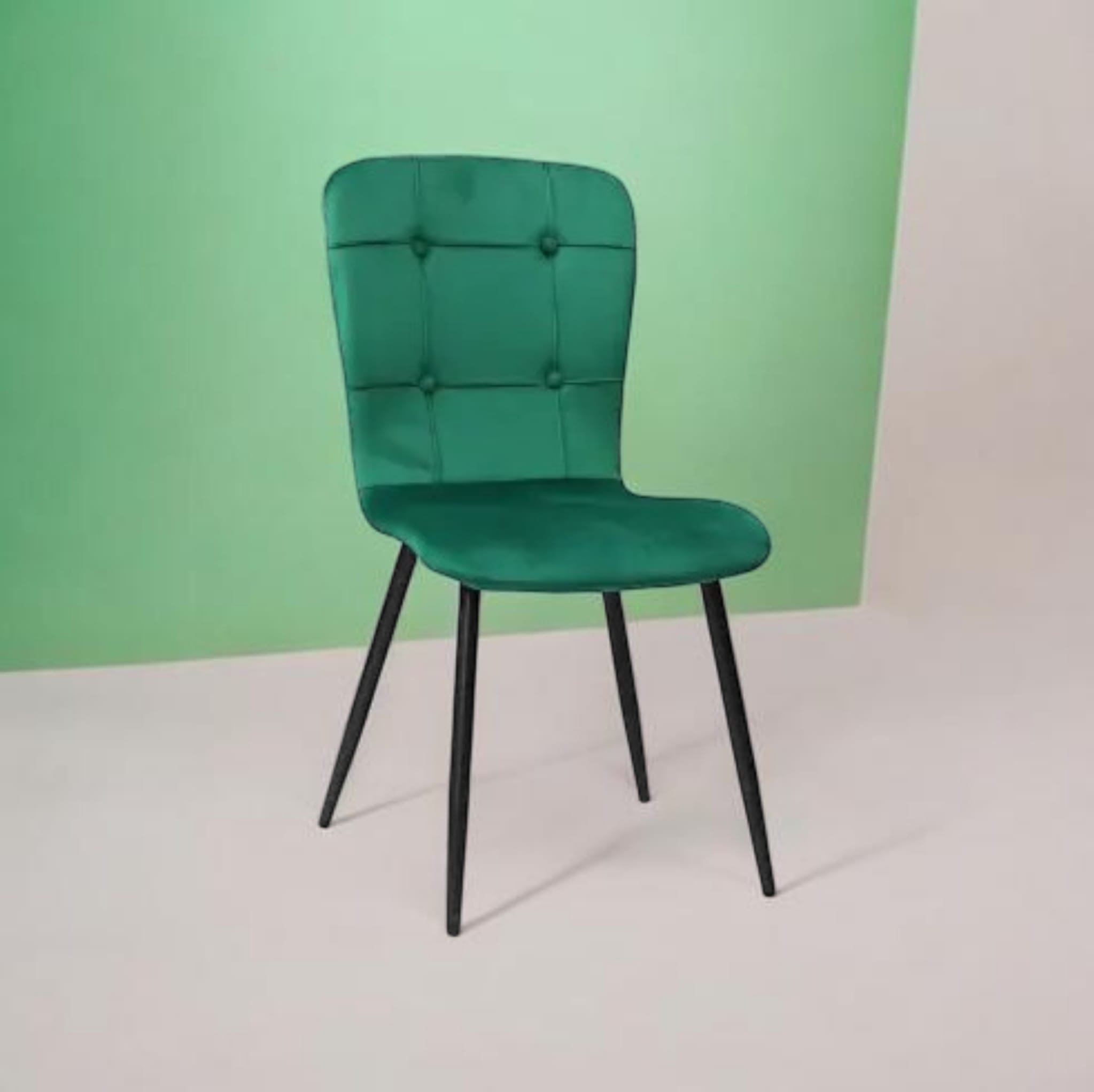 Scaun Luca Verde din catifea Babyface combină design modern, confort și funcționalitate. Șezut și spătar capitonate, picioare metalice negre. Ideal pentru bucătărie, living sau dormitor. Dimensiuni: H 92 cm x L 44 cm x l 43 cm.