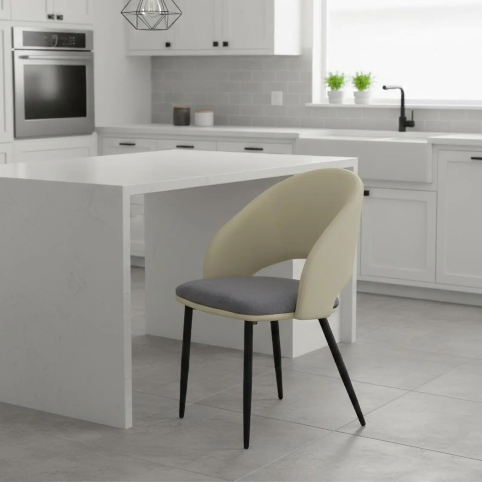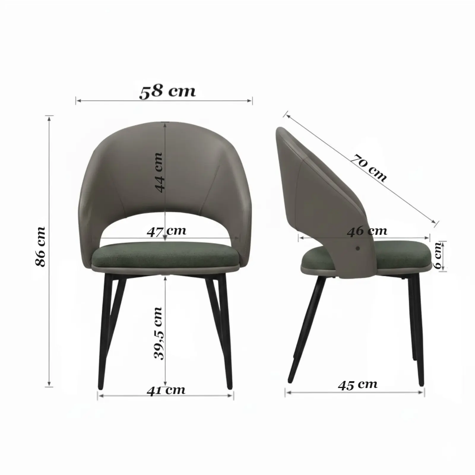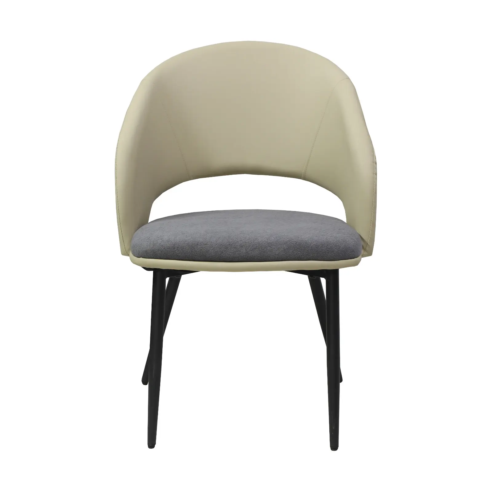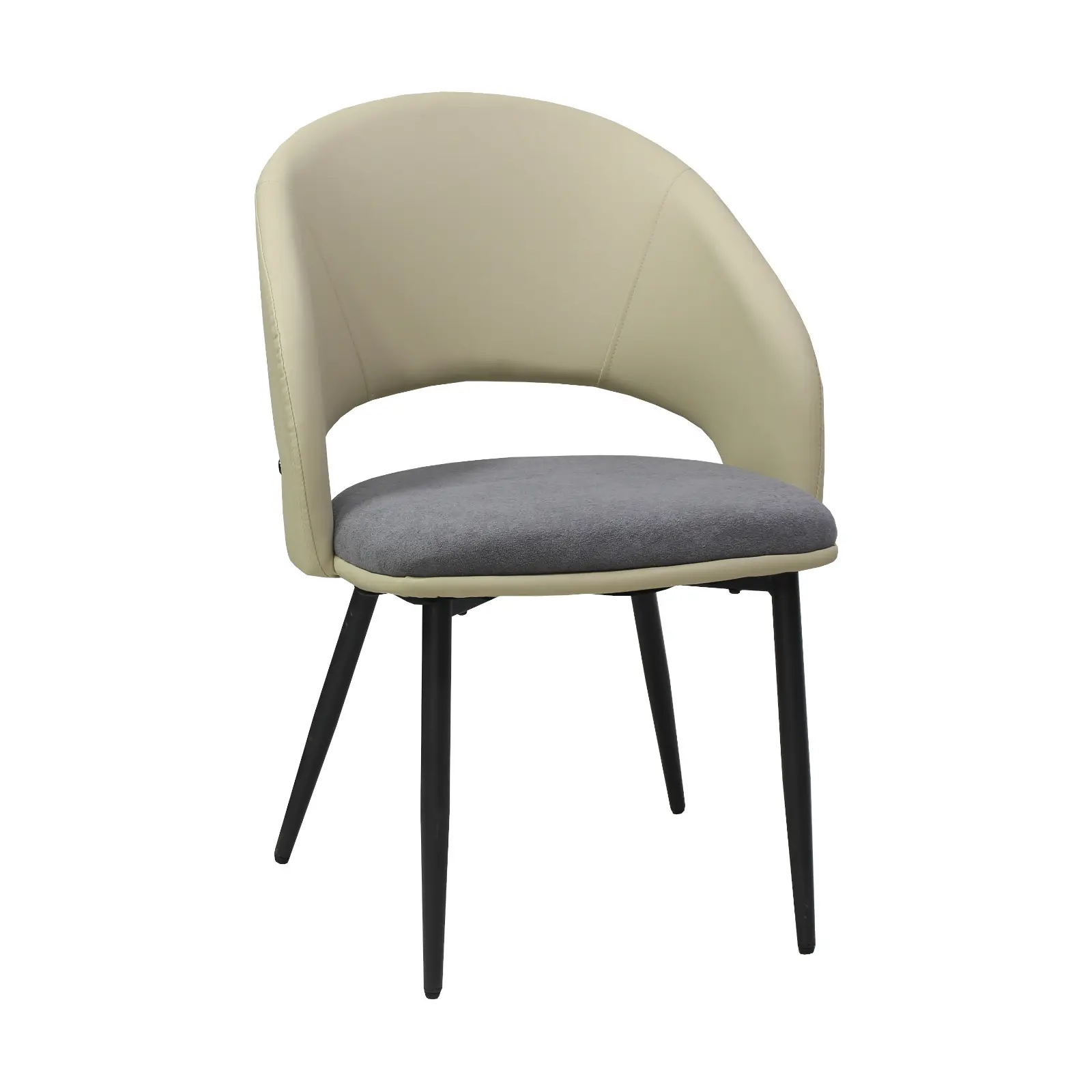 Șezutul și spătarul sunt capitonate cu burete și tapițate cu piele ecologică și material textil, oferind confort și suport ergonomic pe termen lung. Picioarele metalice negre completează designul, aducând stabilitate și un aspect contemporan.