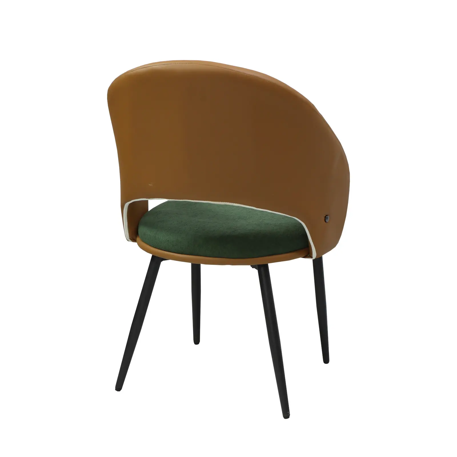 Șezutul și spătarul sunt capitonate cu burete și tapițate cu piele ecologică și material textil, oferind confort și suport ergonomic pe termen lung. Picioarele metalice negre completează designul, aducând stabilitate și un aspect contemporan.