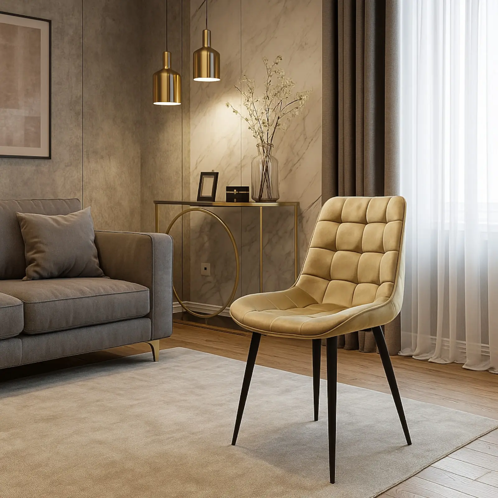 Structura scaunului este realizată din metal rezistent, ceea ce asigură durabilitate și stabilitate în timp. Picioarele metalice de culoare negru mat completează designul modern al scaunului și oferă un contrast plăcut cu tapițeria bej.