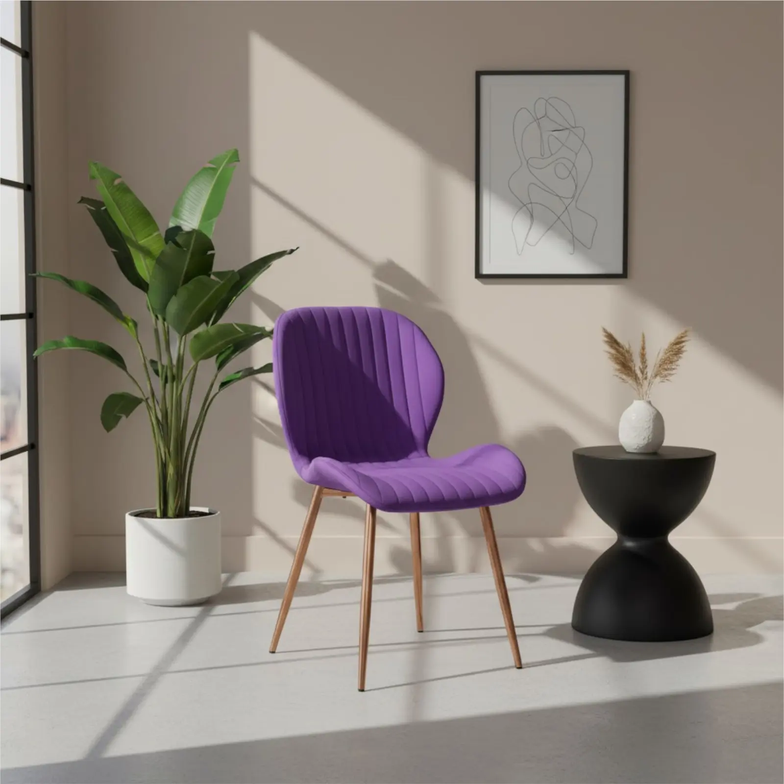 Scaunul Opal Mov combină eleganța cu confortul, fiind ideal pentru bucătărie, living, dormitor sau spații HoReCa. Șezutul și spătarul capitonate cu burete și tapițeria din catifea babyface oferă o senzație plăcută la atingere și susținere optimă. Picioarele metalice în culoarea Gold Rose adaugă un accent modern și sofisticat, completând designul contemporan.