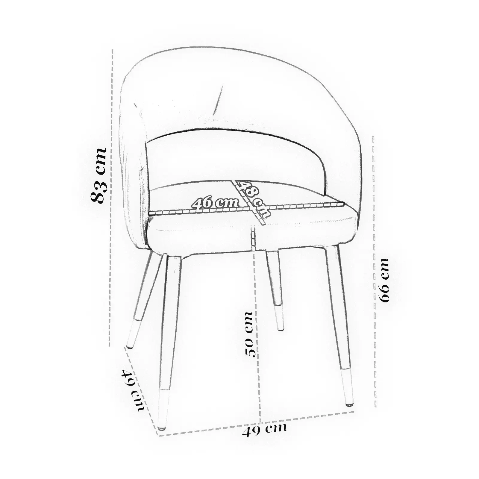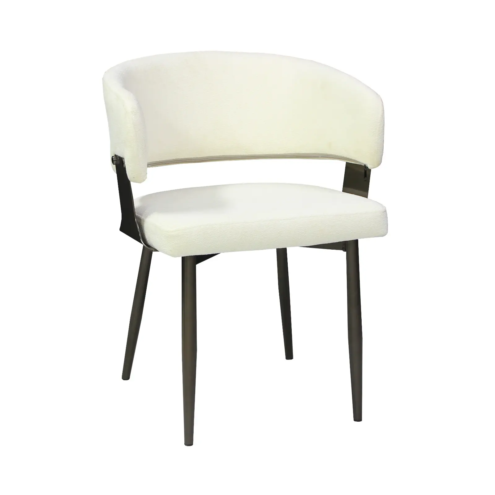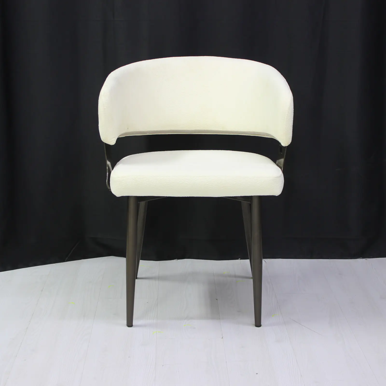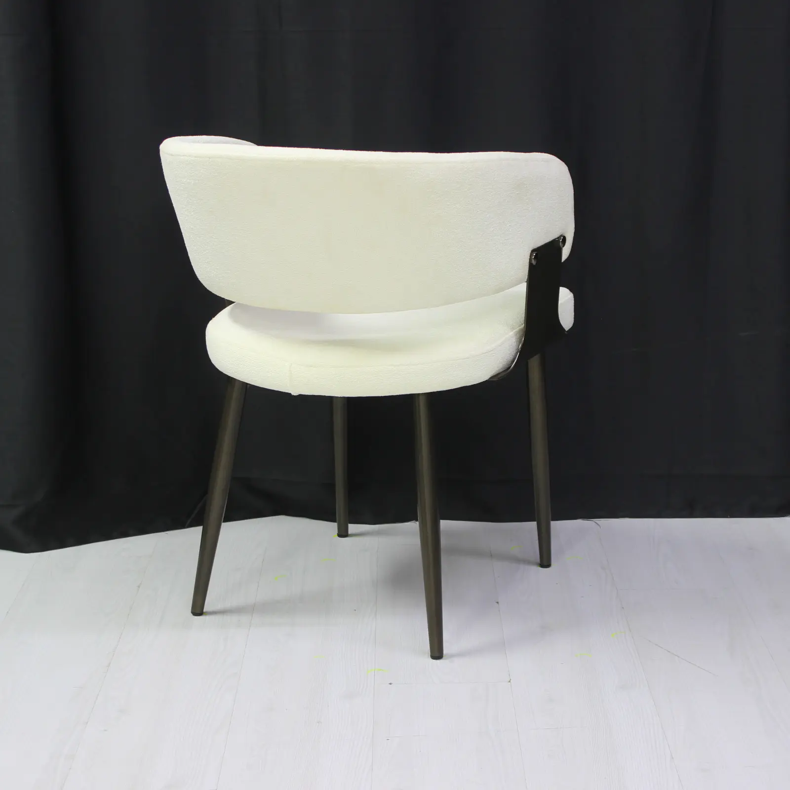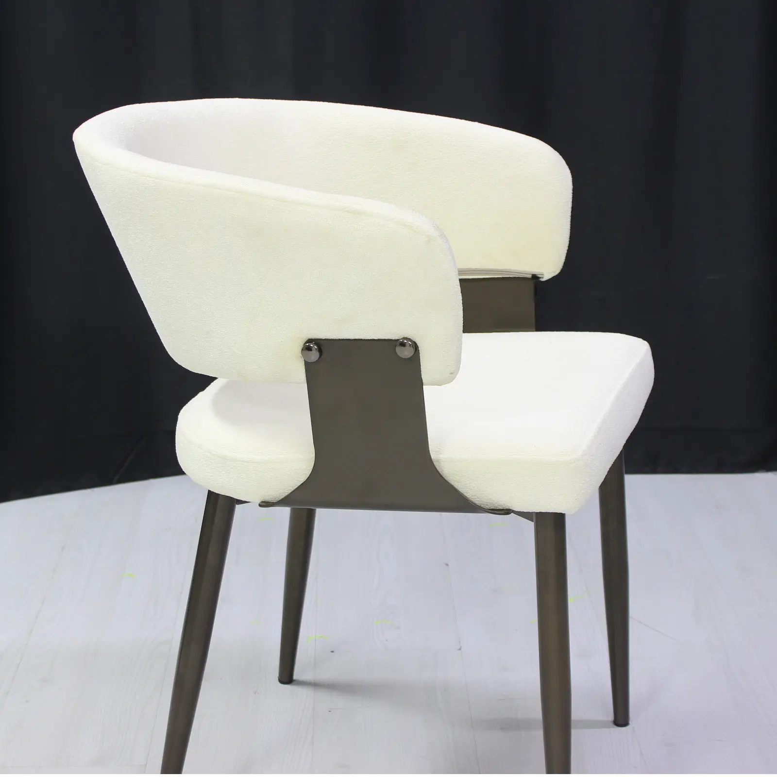 Structura scaunului este completată de picioare metalice solide, finisate în culoarea negru, care oferă stabilitate și rezistență în timp. Această combinație între materialul textil și cadrul metalic conferă scaunului un aspect contemporan și elegant.