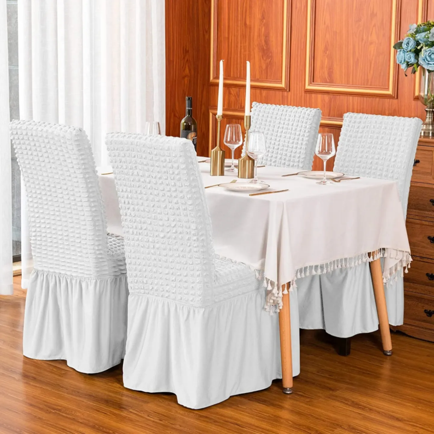 Oferă scaunelor tale un aspect elegant și îngrijit cu acest set de 6 huse creponate pentru scaune, realizate din material elastic și plăcut la atingere. Designul cu volănașe adaugă un plus de rafinament, fiind potrivit atât pentru utilizarea zilnică acasă, cât și pentru evenimente speciale precum mese festive, petreceri sau aniversări.