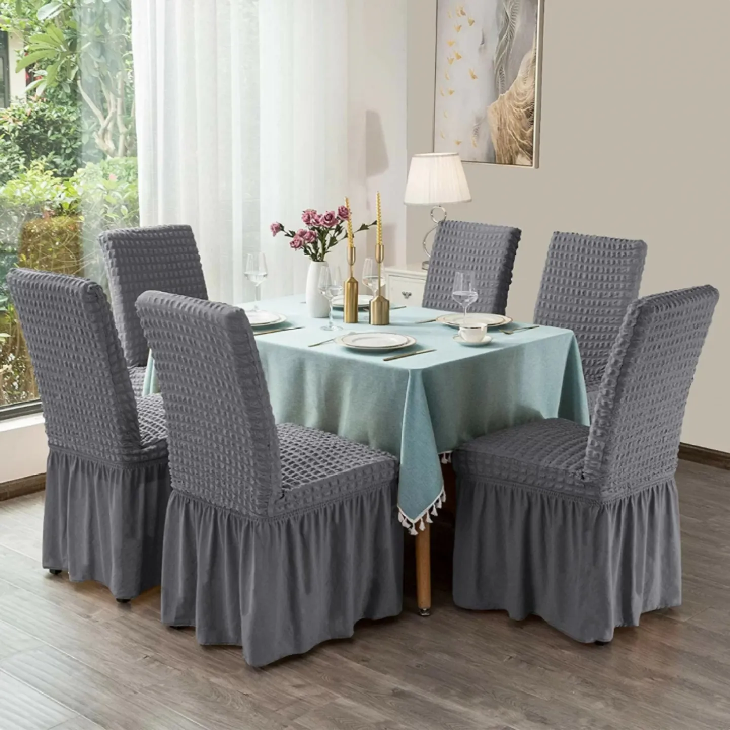 Oferă scaunelor tale un aspect elegant și îngrijit cu acest set de 6 huse creponate pentru scaune, realizate din material elastic și plăcut la atingere. Designul cu volănașe adaugă un plus de rafinament, fiind potrivit atât pentru utilizarea zilnică acasă, cât și pentru evenimente speciale precum mese festive, petreceri sau aniversări.
