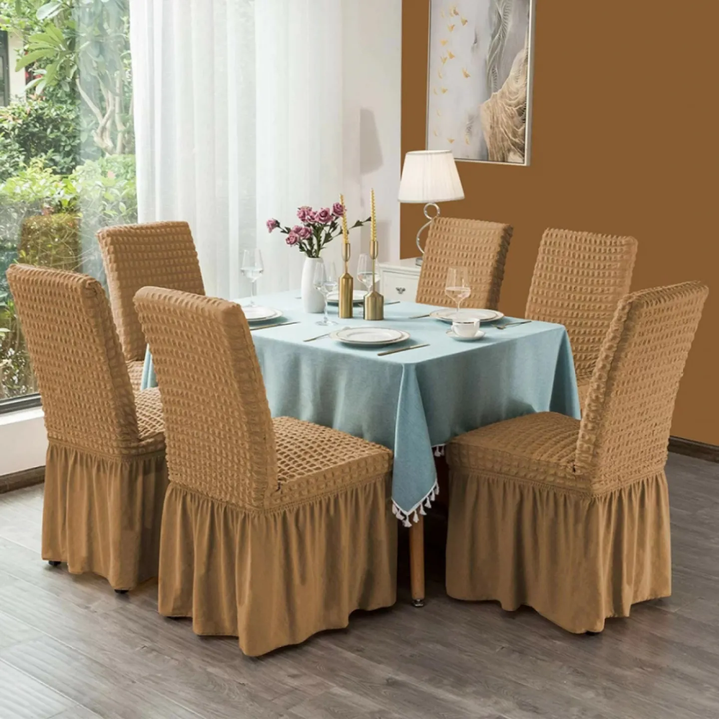 Set 6 Huse Creponate pentru Scaune cu Volănașe, Maro Deschis Elegant, Material Elastic