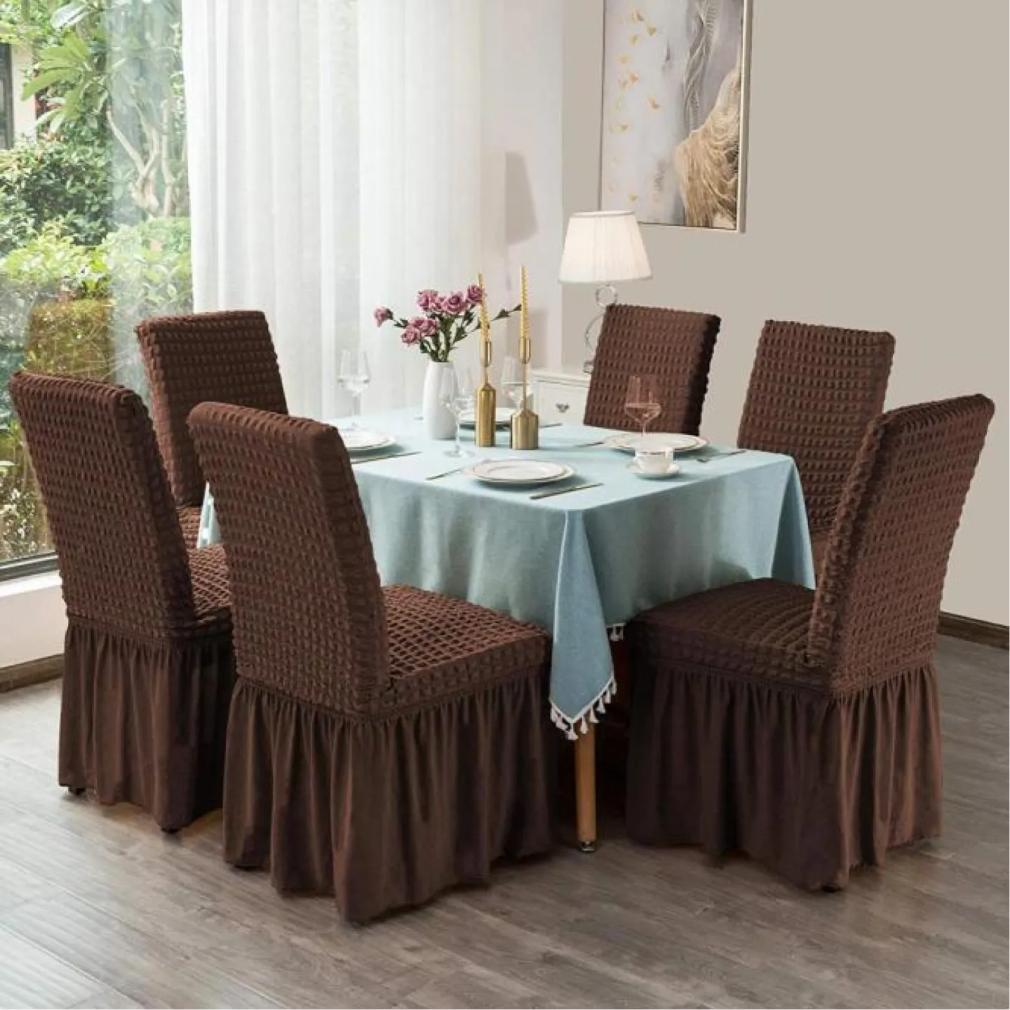 Set 6 Huse Creponate pentru Scaune cu Volănașe, Maro Elegant, Material Elastic